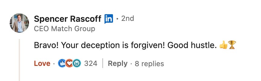 The Zillow dinner was the greatest hustle story of my career, which I wrote about on this viral LinkedIn post. I invented a story to invite Spencer to my house for dinner, then used his name to fill the rest of the seats at the table. Because I didn’t have any money to pay for it, I found a sponsor to cover the whole thing. I never told Spencer this story until he saw my LinkedIn post - and yes, he did chime in on the comments. 😂 Take a look here.